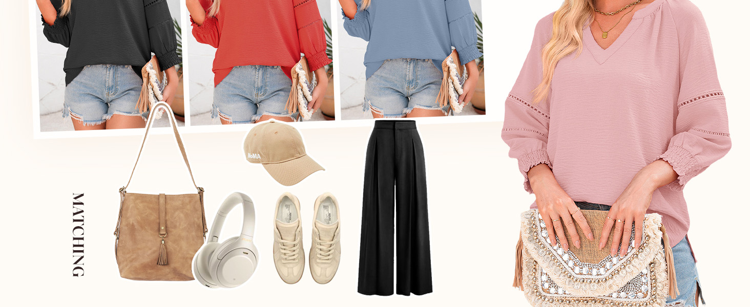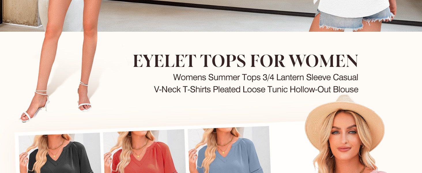 Dokotoo 3/4 Lantern Sleeve Casual V-Neck Pleated Loose Tunic Hollow-Out Blouse