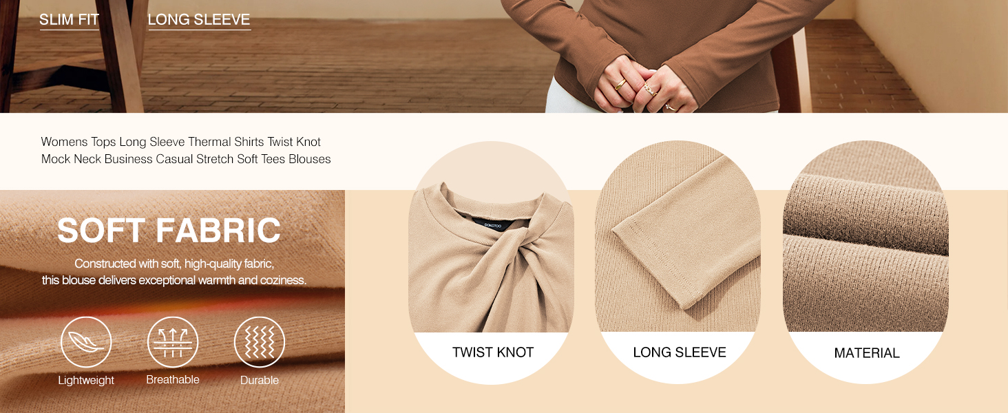 • Dokotoo Womens Tops Business Casual Outfits Long Sleeve Shirts Mock Neck Twist Knot Slim Fit Soft Stretch Tees Blouses
