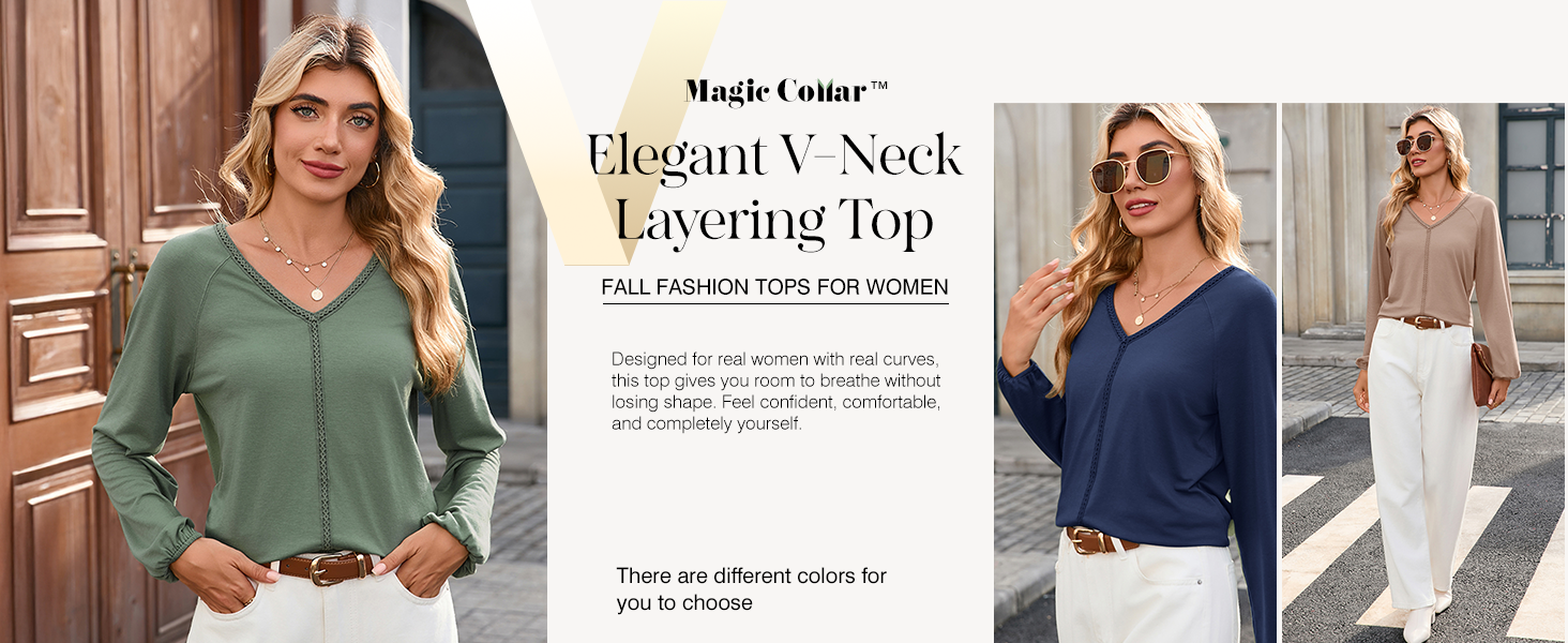 Dokotoo Womens Fall Fashion 2025 V Neck Braid Trim Long Sleeve Tops